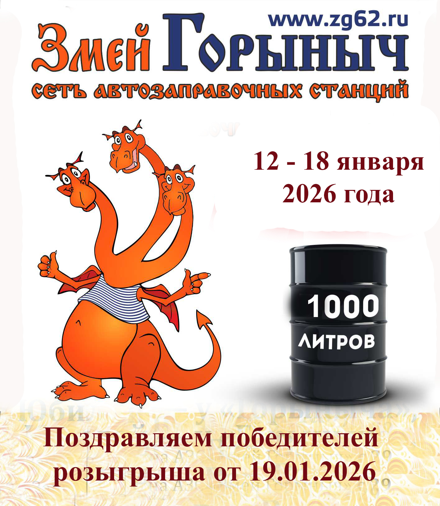 Номинация "Горыныч". Максимальное количество призёров: 5. Число участников: 28. Вероятность выигрыша: 17.86%. Количество подарочных литров: 50. Номера выигравших карт: